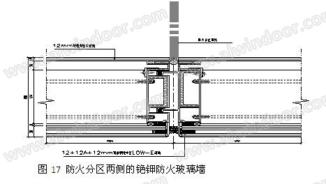 圖17為深圳證券交易中心交易大廳的防火分區處防火墻兩側的處理,是在中空玻璃幕墻平面外,采用單片防火玻璃在防火墻左右兩側各1.5米單獨設置不燃燒墻體。