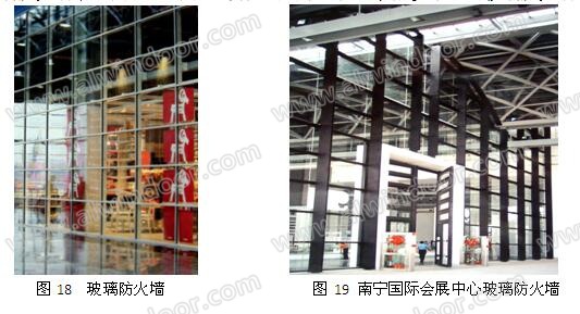樓層上防火單元間通常用防火墻分隔。當建筑設計要求防火隔斷為透明時,可采用玻璃防火隔斷(圖18)。圖19 為廣西南寧國際會議展覽中心的玻璃防火隔斷。