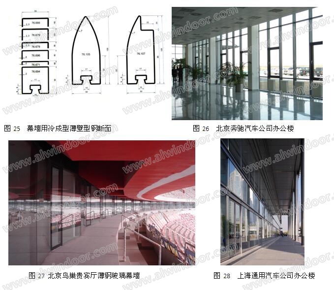 近年來冷成型薄壁型鋼開始在玻璃幕墻中應用,并且相當成功。幕墻專用薄鋼型材外觀上已可與鋁型材比美,壁厚也做到了1.5mm~2.5mm,斷面形式多樣,可以滿足各種玻璃幕墻和玻璃采光頂的要求(圖25)。