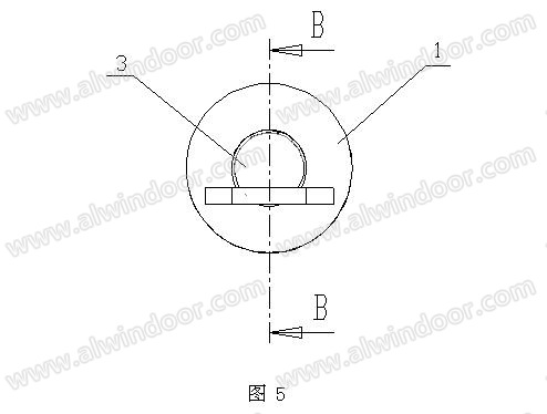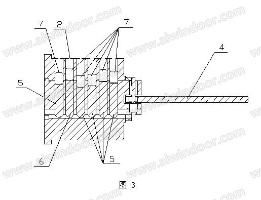 如圖1至3所示,新型技術的帶防撬鎖珠的鎖芯及其鑰匙,包括鎖芯外殼1、鎖膽2和鑰匙8,鎖芯外殼1兩端分別設置有鎖孔3和鎖桿4,鎖膽2固定于鎖芯外殼1內,鎖膽2靠近鎖桿4的一端設置4個下鎖珠5,4個下鎖珠5外側設置1個防撬鎖珠6,防撬鎖珠6外側再設置1個下鎖珠5,防撬鎖珠6的長度為下鎖珠5開鎖狀態時上表面所在平面和下鎖珠5鎖止狀態時下端所在表面的垂直距離,下鎖珠5處于鎖止狀態和開鎖狀態,防撬鎖珠6都是與下鎖珠5鎖止狀態時下端所在平面直接接觸,下鎖珠5和防撬鎖珠6上方設置有上鎖珠7,鑰匙8對應防撬鎖珠6設置通孔9(參閱圖7)。