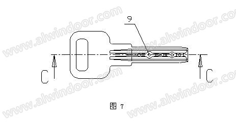 當新型技術在鎖止狀態時,防撬鎖珠6處于開啟位置,其它下鎖珠5則處于鎖止位置,鎖膽2不能轉動;參閱圖4至圖8,在插入鑰匙8開鎖時,由于鑰匙8對應防撬鎖珠6的位置為通孔9,防撬鎖珠6與鎖膽2沒有發生相對的位移,仍處于開啟位置,而其它下鎖珠5則移動至開啟位置,可以順利轉動鎖膽2開鎖。