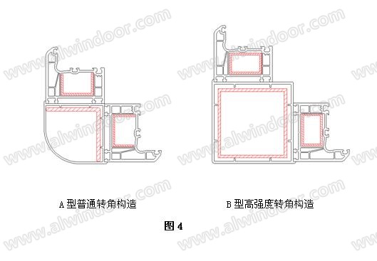 塑料門窗轉角構造根據不同高度可選擇不同強度的配置構造。例如,高度在2800mm以下的選擇A型普通轉角構造配置,高度在2800mm-4500mm的選擇B型高強度轉角構造配置,見圖4所示。
