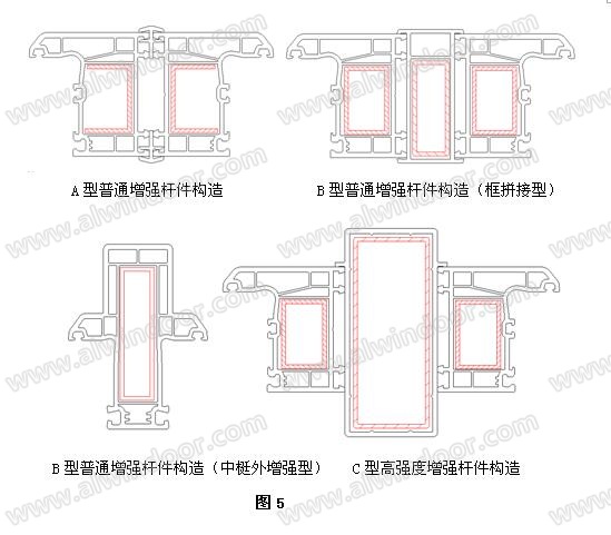 大尺寸塑料門窗主要受力桿件根據不同長度可選擇不同強度的配置構造,主要受力桿件建議盡量選擇豎向通長設計,能更好的滿足強度要求。例如,長度在1700mm以下的選擇單獨桿件(單獨框或梃型材)構造;長度在1700mm-2200mm的選擇A型普通增強桿件構造配置;長度在2200mm-3000mm的選擇B型普通增強桿件構造配置(普通增強桿件構造有框拼接增強和中梃外增強2種構造);長度在2800mm-4500mm的選擇C型高強度增強桿件構造配置,見圖5所示。