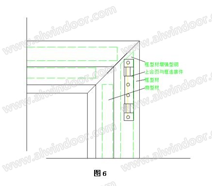 上角部合頁裝配強度是平開窗強度的關鍵點,為了滿足連接強度,上角部合頁裝配對應的框或中梃型材的增強型鋼上端應采取切45度角結構,保證上角部合頁的所有螺釘都能有效固定在增強型鋼上,見圖6所示。