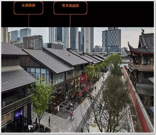 太古里建筑風格為新中式風格時尚街區;多元化的戶外空間,結合廣場和街道的尺度,易形成宜人的商業氛圍;商業街區獨棟建筑體融合周圍保留古跡歷史建筑川西農居風坡屋頂造型、建筑主體深褐色主調色彩搭配等細節,包括2F連廊的地面鋪裝均采用