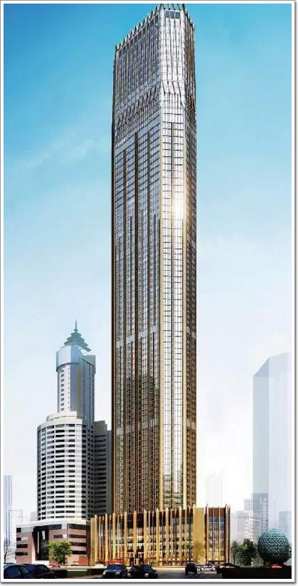 而后,第2次設計將塔樓主體高度降為260m,建筑功能以公寓為主,5層裙房,地下室6層,主體塔樓平面基本形狀沒有太大變化,但核心筒、主體柱位均有調整,基礎底板仍為3m厚,墻、柱均在1.5m厚新澆底板內生根,但在工程施工至地上1層處再次停工了。在第三次動工時,已是在將近4年之后,高度設計為433米,混合結構,后因規劃變動工程第三次陷入膠著狀態。而最終在第4次,即本次設計為改建擴建,改擴建后建筑面積為32.12萬m2,其中地上建筑面積為26.38萬m2,地下建筑面積為5.74萬m2,地下7層~地下2層為車庫,地下1層至裙房5層為商業區,6層局部為復式停車庫;主體塔樓由下至上為高級公寓、甲級寫字間、會所及設備層等,主體建筑平面仍為削角矩形。