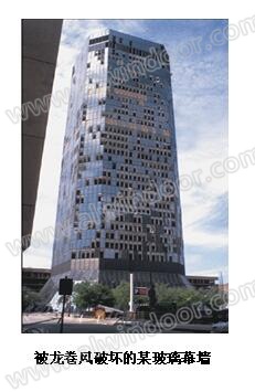 超高層建筑所處的風環境相對復雜,風壓分布不均勻且風速過大。風速、風壓會隨著建筑高度的增加。如城市市區C類地面粗糙度,高度為400、450米的風壓高度變化系數Mz=3.12,100米時為1.70,150米時為2.03,200米時為2.30,300米時為2.75等。這點對于以風荷載作為控制荷載的幕墻是極重要的。當建筑造型布局不當時,在建筑物外部往往造成局部不良的風環境:掀起屋頂覆蓋物、破壞圍護結構、幕墻玻璃、門窗等。超高層建筑采用玻璃幕墻作為圍護結構,在風荷載作用下外皮破壞或掉落對周圍街道及行人會造成重大傷害,容易出現安全隱患的部位主要集中在懸挑外裝飾構件及外部遮陽結構。例如:遭到龍卷風襲擊的美國田納西某摩天大樓,玻璃幕墻嚴重破壞。