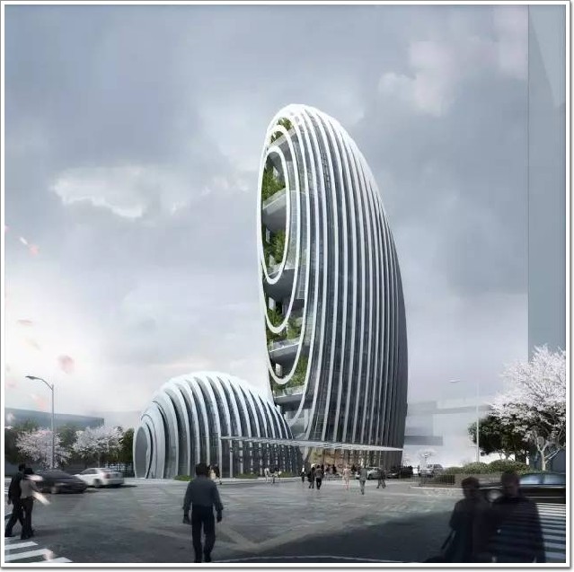 Lè Architecture大廈位于臺北市南港高科技園區,建筑面積為14169平方米,該項目是一棟擁有獨特美學造型的辦公大樓,整體以鵝卵石為設計藍本,玻璃幕墻呈圈狀“懸掛”在建筑主體之上,猶如鵝卵石上經過河床沖刷之后留下的自然的“年輪”一般,非常獨特,而從大廈的另一側俯瞰,又呈現出貝殼的形狀,通身綠意盎然,又多了幾分海洋氣息,可見建筑師在大廈整體設計上的獨具匠心。