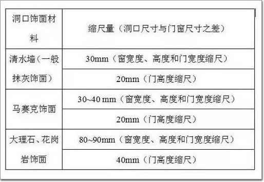 下表是幾種較常見飾面材料使用的門窗縮尺量,后面所述的常規縮尺均按此進行。
