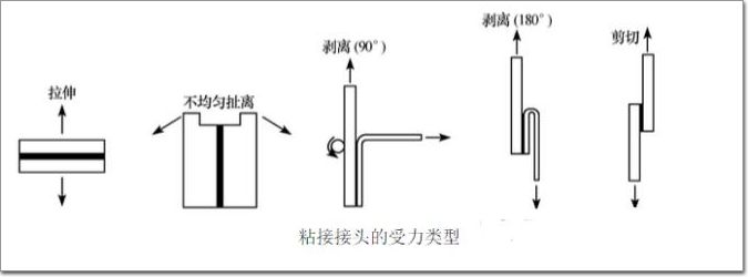 粘接接頭在外力作用下膠層所受到的力,可以歸納為剪切、拉伸、不均勻扯離和剝離4種形式。