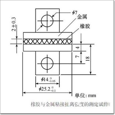 非金屬與金屬粘接拉伸強(qiáng)度的測定,采用兩金屬間夾一層非金屬的方法。在此,介紹一下橡膠與金屬粘接扯離強(qiáng)度的測定方法。橡膠厚度為(2±0.3)mm,粘接后的試件尺寸如下圖所示。
