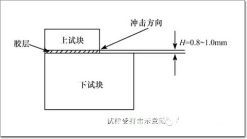 由2個試塊膠接構(gòu)成的試樣,使膠接面承受一定速度的剪切沖擊載荷,測定試樣破壞時所消耗的功,以單位膠接面積承受的剪切沖擊破壞力計(jì)算剪切沖擊強(qiáng)度。