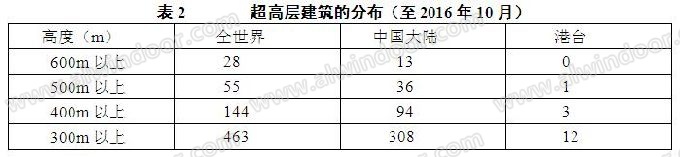 筆者根據手頭資料的不完全統(tǒng)計,截至2016年10月,包括已經立項、設計中、施工中和已經建成的超高層建筑,數(shù)量分布見表2。