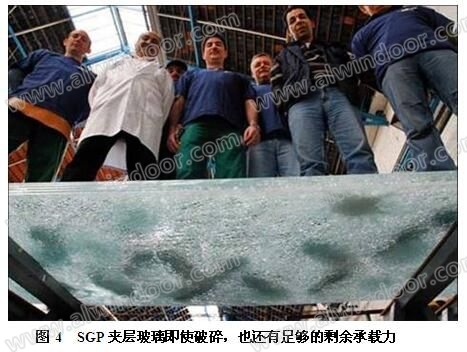 SGP 間膜夾層玻璃整體性好,SGP夾膠膜的撕裂強度是PVB夾膠膜的5倍,即使玻璃萬一破碎,SGP膜還可以粘結碎玻璃形成破壞后的一個臨時結構,其彎曲變形小,還可以承受一定量的荷載而不會整片下墜。這就大大提高了玻璃的安全性(圖4)。