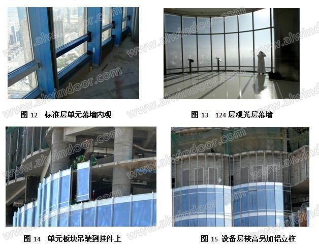 哈利法塔的高度為828m,是目前世界上最高的建筑幕墻。建筑幕墻總面積為13.5萬㎡,其中塔樓部分為12萬㎡。在塔樓幕墻中,玻璃10.5萬㎡,不銹鋼板1.5萬㎡。采用單元式明框幕墻(詞條“明框幕墻”由行業(yè)大百科提供),共有23566個單元板塊(圖9 ~圖15)。本工程由中國承建,玻璃、鋁型材、五金件和密封膠均采用中國產品。