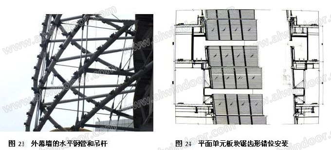 外幕墻采用超白半鋼化SGP夾膠玻璃。12mm超白+1.52mmSGP+12mm超白。由于外幕墻有螺旋上升的造型,為復雜的雙曲面,為此平面板塊單元錯縫鋸齒形安裝,擬合造型曲面(圖24、圖25)。