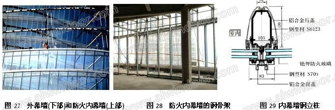 內幕墻為防火幕墻,采用(8mm超白+0.89mmSGP+8mm超白)+12A+8mm銫鉀防火玻璃。支承結構均采用冷彎薄壁型鋼,梁壁厚3mm,柱壁厚4mm。鋼結構外包鋁型材(圖27~圖29)。