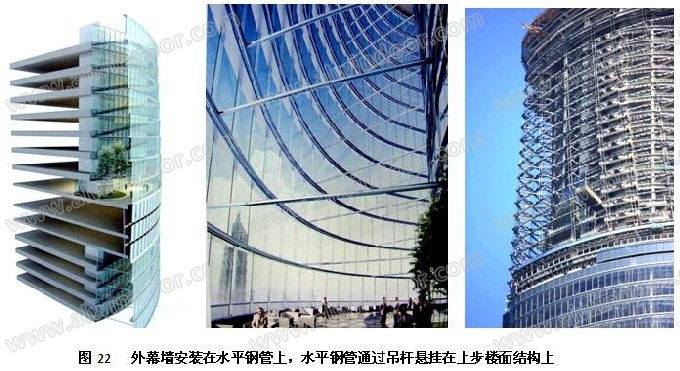 內幕墻與外幕墻之間形成12~15 層高的內庭,按防火要求,內幕墻必須為防火幕墻。內幕墻直接支承在樓面結構上,外幕墻每12層~15層為一組,通過水平鋼管和豎向吊桿懸掛在上端外挑的樓面結構上(圖22、圖23)。