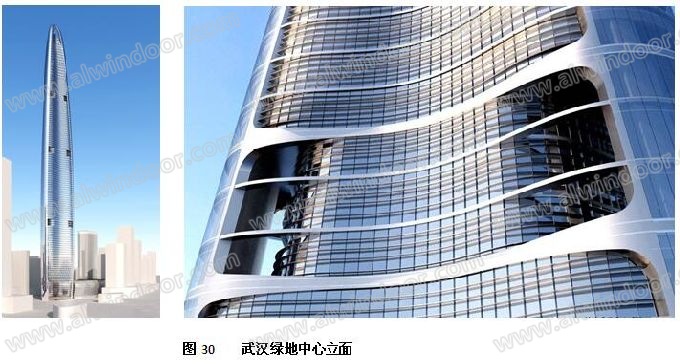 武漢國際金融中心,即武漢綠地中心,高度636m,125層。平面為圓角三叉形,豎向逐漸內收呈圓滑曲線(圖30)。立面上開有喇叭形洞口,可以減少主體結構和幕墻所受的風力(圖31)。