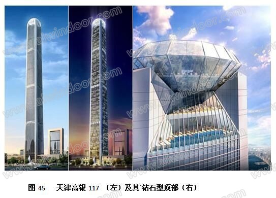 天津高銀117高度為592m,117層。32、63、94和115~116層為高層大堂,頂部設有鉆石型玻璃頂(圖45)。