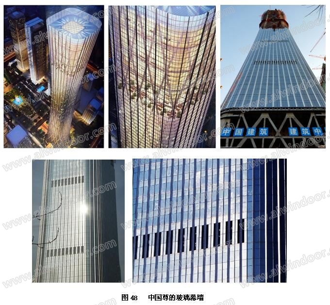 中國尊位于北京,是8度抗震設防世界最高的建筑,地上108層,高度528m(圖48)。明框幕墻,玻璃配置為超白雙銀、鋼化、外玻璃SGP夾膠、中空。