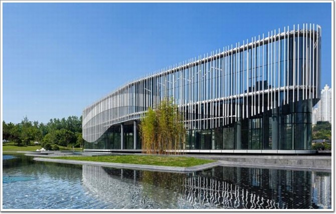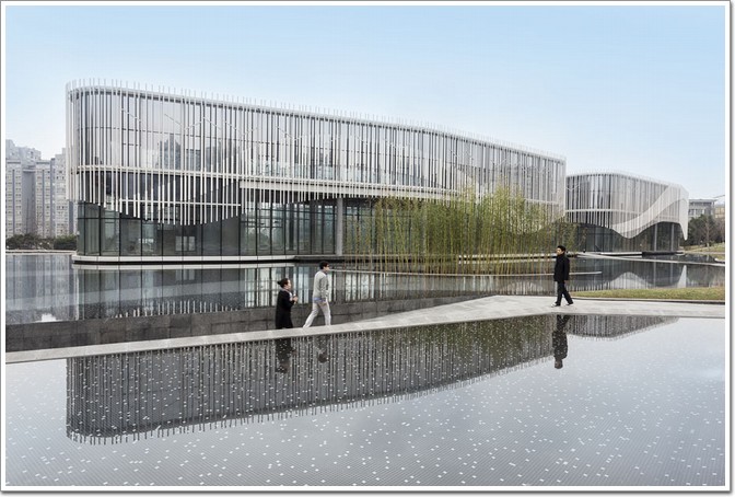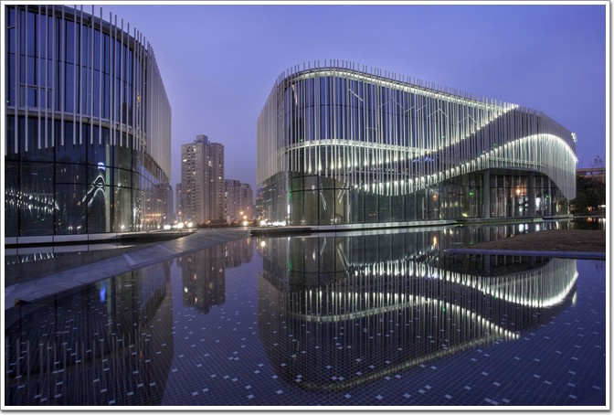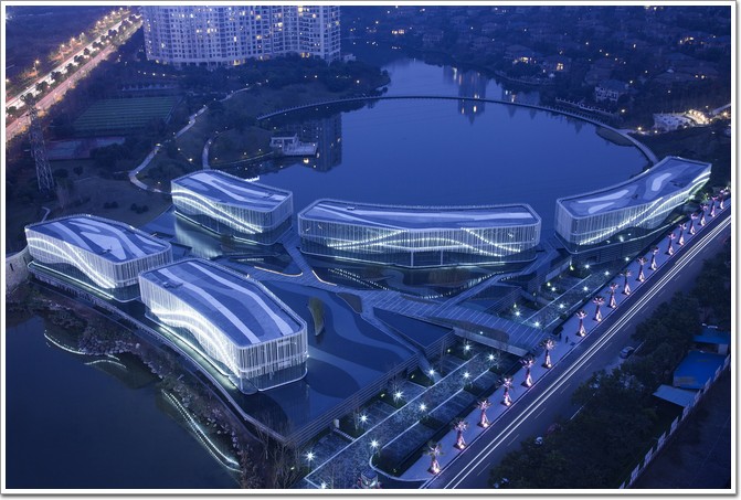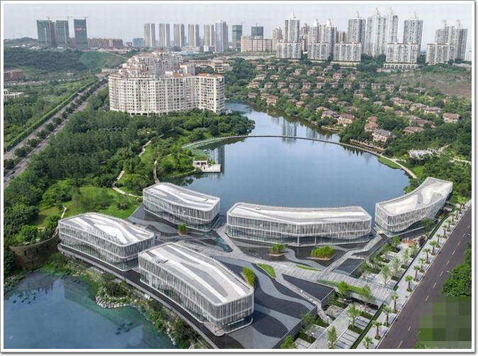 在建筑的外觀上,棕櫚島也擁非常獨一無二的外立面,棕櫚島五棟建筑體均采用水晶般的玻璃幕墻系統,360度無死角外景欣賞,在建筑主體之外,還另外覆蓋了一層粗細不同且錯落有致、晶瑩剔透的白色陶管,以形成水簾的效果,外立面的設計是也專為棕櫚島建筑定制的,別致的陶管與湖水相呼應而產生出的韻律感,讓這五棟建筑仿佛自水中沐浴而出,它動感流暢的建筑線條、鮮明的材質對比、明快簡潔的色彩搭配,水和光影與建筑融為一體,營造出時尚優雅的商業氛圍。此外,陶管在鏡面上產生反射,白天在日光下產生豐富多變的光影效果,夜間更是晶瑩剔透,這使得建筑與自然環境之間顯得更加和諧,閃耀,非常具有夢幻效果。