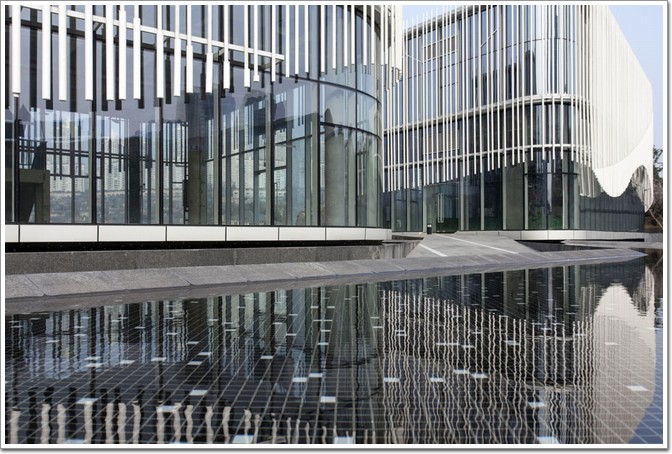 棕櫚島分為六個獨立餐廳,這六個餐廳布置成獨立的五個建筑體,全部沿兩個湖泊而建,排成一個八字形,這五個單體建筑之間則用水道相連,形成“水的庭院”餐飲場所,使得各個餐廳一面享有自然的水景,另一面則可享有人造水景形成的私密庭院空間。從餐廳內望向湖面的視線全無遮擋,并且通過打造無邊界水池的做法將人工水景與自然湖面在視線上連成一體。放眼望去,湖面上的倒影與建筑本身不斷交錯,相映成趣。這一視覺特點也讓湖面上的倒影與陽光的折射變成棕櫚島最豐富的建筑特色。