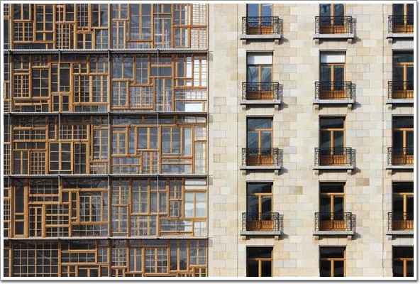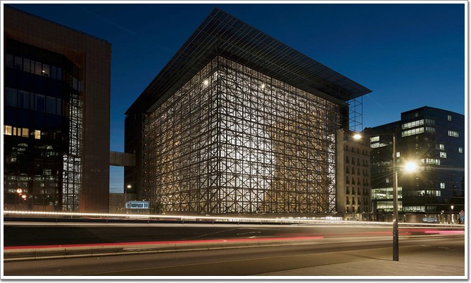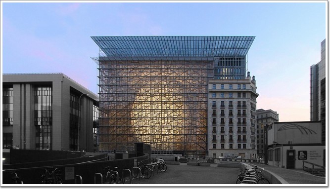 新的大樓與歐盟的理事會大樓相鄰,新舊兩座大樓之間通過人行天橋相連,位于它旁邊的舊大樓名為Justus Lipsius ,始建于80年代,在那個時候,歐盟還只有12個成員國。在整體設計上,原始的建筑立面,入口和底層中央走廊因被列入遺產列表而得到保護,因此被完整地保存下來,新的構造填補了現有L形平面中的空白。大樓的外立面全部用的是玻璃幕墻,而在新大樓內部設計有一個被巨大的凸出燈籠狀結構包圍的玻璃中庭。外立面則由3750個再生木制窗框結合玻璃組成,所使用的窗框據稱是從28個成員國(英國脫歐之前)那里回收得來的,遠遠看上去,倒有幾分中國風的意思,而這個燈籠造型外罩方形立方體的建筑,因其超現實的樣貌,獲得“太空蛋”的稱號。