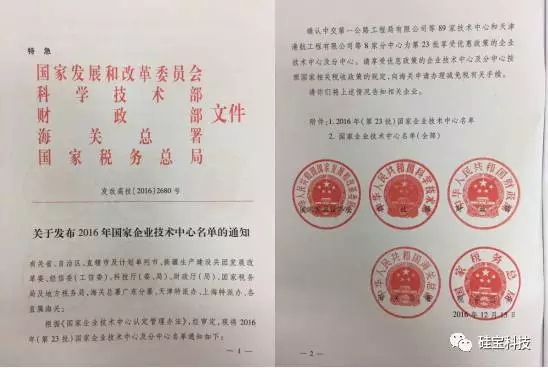 根據國家發展和改革委員會、科學技術部、財政部、海關總署、國家稅務總局聯合發布的2016年第2680號文件,成都硅寶科技股份有限公司技術中心被認定為“2016年(第23批)國家企業技術中心”。成都硅寶科技股份有限公司技術中心成為中國有機硅橡膠行業第一家、唯一一家國家企業技術中心。