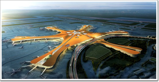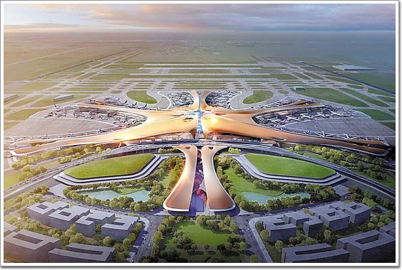 京新機場又稱北京大興國際機場、北京首都第二機場,未來將成為世界最大的空港。新的一號航站樓設計為輻射狀,目的在于減少乘客的換乘距離,盡管從一端到另一端還是超過了1公里。哈迪德最標志性的設計或許是平滑起伏的屋頂外觀。