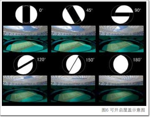 中心賽場是一座具備可開啟屋蓋的現代化多功能場館。屋面的開啟方式如圖6所示。兩片半葉形的屋面各自沿著一個圓形軌道運動,運行180°后完全開啟,同向再運行180°后關閉。