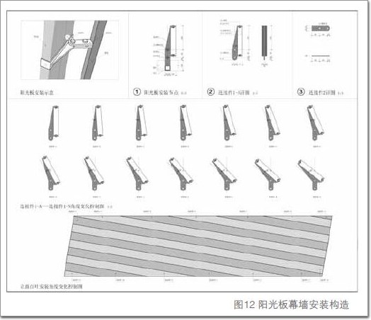 由于立面上的各層陽光板從設計效果上要求被扭轉成不同的角度,因此設計了14種不同角度的連接件。施工人員無需關注到底需要將幕墻單元扭轉多少,他們只需按照立面圖紙所示的分區,將不同的連接件安裝至檁條上,然后將每一塊幕墻單元與連接件連接即可達到設計要求(圖12)。