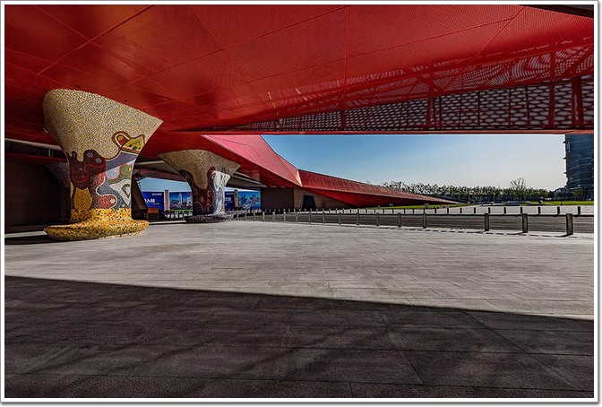 棲鳳橋在鋪裝設(shè)計(jì)上,采用了簡潔時(shí)尚的深灰色和淺灰色石材混搭,運(yùn)用流線動感的線條來演繹,整體感覺活力熱情,呼應(yīng)橋的折線主題,營造時(shí)尚海濱的休閑漫步廣場。柱墩的創(chuàng)意靈感來自“淵源共生,和諧共融”的“祥云”圖案,神獸和祥云的結(jié)合預(yù)示著大吉大利,蓬勃發(fā)展,柱墩的材質(zhì)采用安東尼·高迪先生的陶瓷鑲嵌藝術(shù),既豐富了橋底的空間特色,又和沿海文化相互呼應(yīng)。