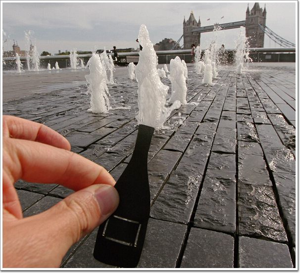 在塔橋附近的噴泉上,泉水就像從麥克爾的香檳酒瓶剪紙中噴出來一樣。麥克爾說這是他最喜愛的作品,嘗試拍攝了50次
