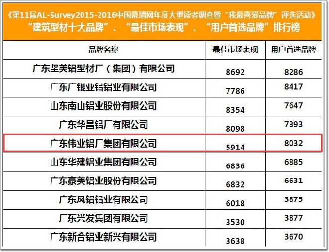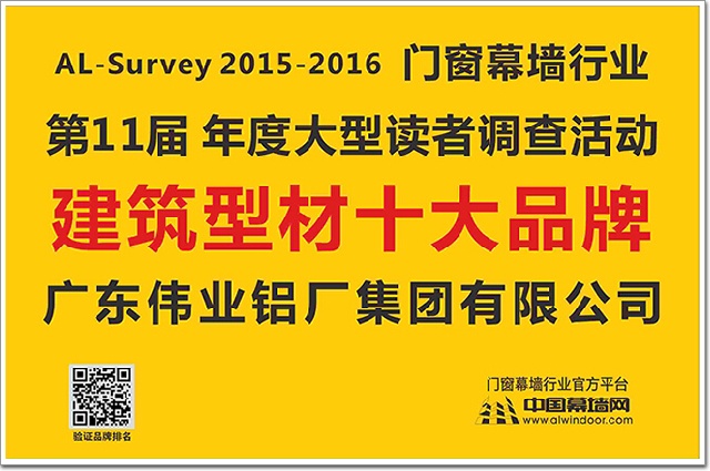 偉業(yè)鋁材自2015年9月開始征集本次活動以來,備受業(yè)界關注,在歷經(jīng)6個月的層層篩選后,最終憑借企業(yè)實力成功入圍第11屆AL-Survey 2015-2016年度 “建筑型材十大品牌”獎項,該獎項代表了國內(nèi)建筑鋁型材的最高水平,偉業(yè)鋁材做為行業(yè)領軍企業(yè),展現(xiàn)了其企業(yè)實力和產(chǎn)品品質。