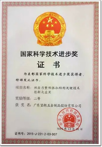 中共中央、國務院2016年1月8日上午,在北京人民大會堂,隆重舉行國家科學技術獎勵大會。黨和國家領導人習近平、李克強、劉云山、張高麗出席大會并向獲得國家自然科學獎、國家技術發明獎、國家科學技術進步獎和中華人民共和國國際科學技術合作獎的代表頒獎。在295項獲獎名單目錄中,有一位來自門窗幕墻行業的企業代表,由堅朗參與的科技項目《預應力整體張拉結構關鍵技術創新與應用》獲得國家科學技術進步二等獎。