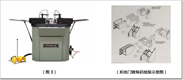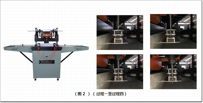 在系統門窗角部加工時,需對沖鉚精度加以控制。在工藝中還需增加角部注膠工序,對于設備來講,需要有一開闊的組角操作空間,同時應有大截面沖鉚范圍,為滿足此工藝需求,平和公司提供一款重型的沖鉚機(見圖3),采用氣液增壓系統,低壓接近型材,高壓沖鉚,后定位采用上下移動,給操作者提供便利的裝配空間。沖鉚力可達到6~7噸,保障沖鉚的強度。