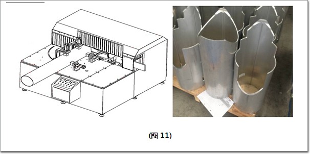 該技術的典型代表為金工生產的鋁圓管相貫曲面的機加工設備,如圖11所示。本裝備一側設有機加工臺一側設有機加工總成的機架,機加工臺包括控制裝置,及用于夾緊鋁圓管的夾具總成;機加工總成包括橫向進給機構、縱向進給機構、深度進給機構、用于加工鋁圓管相貫曲面的刀具組件及用于用于驅動刀具組件的刀具旋轉的驅動機構;刀具組件和驅動機構安裝在縱向進給機構上,兩進給機構之間通過上下調節機構連接,且兩進給機構與控制裝置及氣液串聯缸連接。本裝備專門用于鋁圓管相貫曲面的加工,且適用于不同直徑的鋁圓管,自動化程度高、加工速度快,可降低員工的誤操作頻率、勞動強度和加工時的危險性,同時有助提高良品率,尤其是提高大直徑鋁圓管加工的良品率;江河幕墻利用這款設備的加工性能成功中標(詞條“中標”由行業大百科提供)位于卡塔爾多哈西部海灣區的一項大型綜合商業發展項目---巴瓦金融中心。因該款新設備的出現為江河幕墻節約因此項目而重新投入的加工設備總額接近一個億,不僅解決了大量固定資產的投入問題,同時解決技術、場地等多個問題。