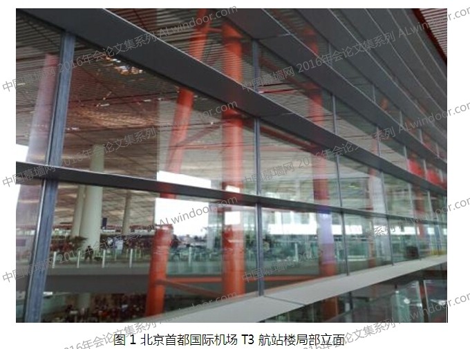 圖1為北京首都機場T3航站樓EWS-1系統的典型局部立面,玻璃分格尺寸為3500mm(寬)×1800mm(高),玻璃采用12+1.9PVB+12+16A+15的中空鋼化夾膠LOW-E玻璃,鋁合金橫梁跨度為10.5m。