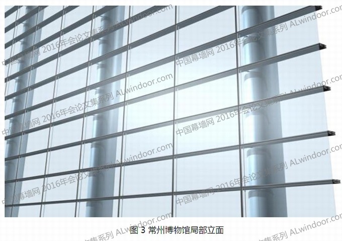 圖3為常州博物館的典型局部立面,玻璃分格尺寸為2200mm(寬)×1200mm(高),玻璃采用8+12A+8的中空鋼化LOW-E玻璃,鋁(詞條“鋁”由行業大百科提供)合金(詞條“合金”由行業大百科提供)橫梁跨度為6.6m。