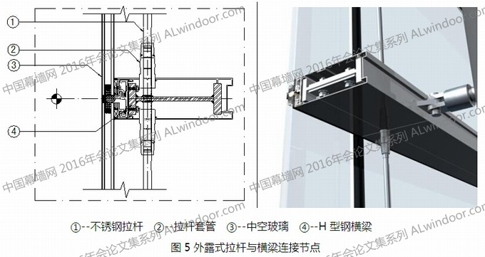 為了達到最優的立面效果,設計通常將豎向吊索隱藏于玻璃板塊的豎向拼縫位置,鋼橫梁通過特制的緊固件與通長拉索固定(詞條“固定”由行業大百科提供),所有的連接構造在幕墻十字接縫處的內部空間完成。拉索穿過鋼板連接件的孔位設計成大圓孔或長圓孔,以減少橫梁在風荷載作用下的變形位移對拉索受力產生的影響。因橫梁跨度通常都比較大,所以設計采用鋼橫梁作為主受力構件,可以優化結構受力性能,從而獲得更小的桿件(詞條“桿件”由行業大百科提供)截面和更低的經濟投入(圖4)。