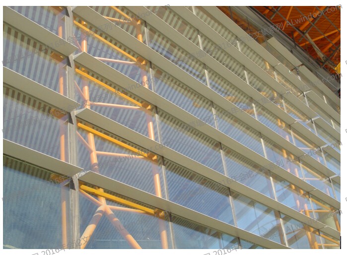 為滿足建筑使用要求,在幕墻外部設置水平遮陽板,結合幕墻的結構體系,綜合考慮之下,將橫向水平鋁合金橫梁截面(詞條“截面”由行業大百科提供)向幕墻玻璃面外延伸形成一定寬度,具有遮陽效果,同時本橫梁又作為幕墻結構體系中水平抗風桿件,從而既滿足了建筑要求,又滿足了結構受力要求,可謂是建筑與結構經典的結合。