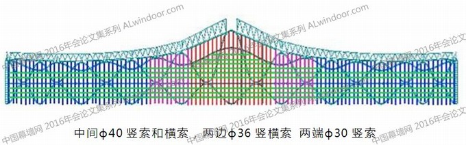 上圖中定滑輪固定在鋼彩帶預留的孔洞中,豎索穿過定滑輪,上下可以自由滑動,水平能傳遞荷載給鋼彩帶,定滑輪的摩擦系數非常小,能有效的防治豎索磨損。為了更有效的防治不銹鋼豎索磨損,定滑輪的兩個滑輪的材質采用的是比不銹鋼軟的鋁,這樣,即使有磨損,高預應力的不銹鋼絲也能得到保護。為了構造簡單及施工方便,橫索采用分段設計和施工。