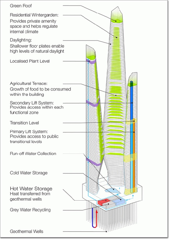 此項目被命名為“生態建筑”(Arcology)摩天大樓——使用了一個結合了建筑和生態的術語。這是WestonWilliamson建筑師旨在強調結合交通的一系列建筑之一。“如果建筑正下方沒有高鐵線,就沒有這座生態建筑塔樓。”