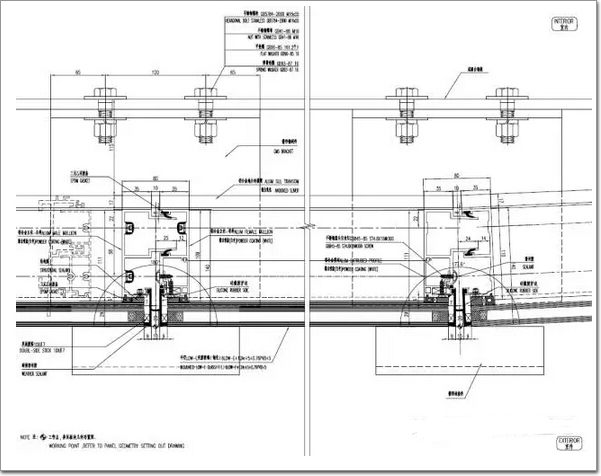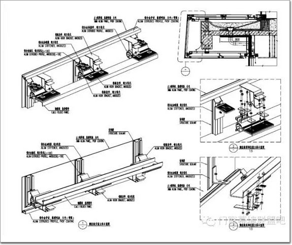 如果說采用現場成型是實現銀河SOHO工程鋁板造型的關鍵性第一步,那么節點設計,現場安裝就是實現手段,同等重要。銀河SOHO工程鋁板幕墻層間典型節點見右圖,由節點可知 ,該鋁板系統由“上部鋁板連接系統”與“下部鋁板連接系統”組成,上下連接系統結構形式完全相同。