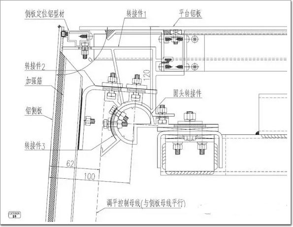 o1.首先定位“圓頭轉接件”位置。由右圖可知“轉接件1”直接安裝在“圓頭轉接件”上,“圓頭轉接件”的高度、進出位置直接影響以后平臺板安裝,因而其安裝位置必須準確。o2.“側板定位