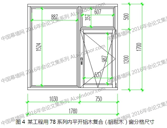 某工程用78系列內平開鋁木復合(鋁包木)窗位于建筑物底層,室外操作方便,采用“熱阻法”測試。該窗分格尺寸見圖4,整窗面積為3.03m2 ,玻璃面積為2.10m2 ,框面積為0.93m2 ,玻璃邊緣長度約為9.8m,傳熱系數K值經實驗室檢測為1.4W/(m2 ·K)。