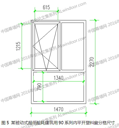 某被動式超低能耗建筑用90系列內平開塑料 (詞條“塑料”由行業大百科提供) 窗位于中高層,室外操作不便,采用“內表面溫度法”進行測試。該窗分格尺寸見圖5,整窗面積為3.34m2 ,玻璃面積為2.58m2 ,框面積為0.76 m2 ,玻璃邊緣長度約為11.7m,傳熱系數K值經實驗室檢測為0.8W/(m2 ·K)。