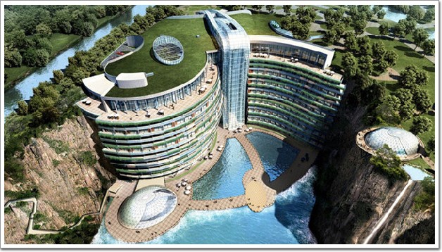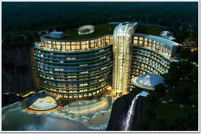 據悉,“深坑酒店”總投資6億元左右,選址在一座深達80米的廢棄大坑,所在之處猶如一個大型的斷崖,但并非為全封閉地貌,不過還是有人為此擔憂酒店的采光和通風環境。建成后酒店將擁有370間客房,地上兩層、地下17層和水下兩層,這里有最值得期待的與崖壁自然融合定制的空中花園、從相同高度懸崖上垂掛而下的壯觀瀑布、景觀總統房、水中情景房等等,每一處都呈現出獨一無二的景觀奇跡。