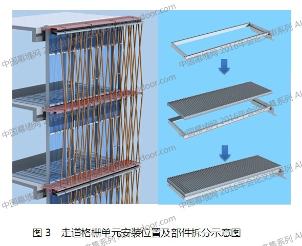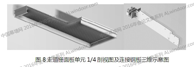 玻璃單元與格柵單元之間有760mm的間距,在該間距層間位置上設(shè)計(jì)水平鋁合金格柵,形成走道格柵面板 單元。